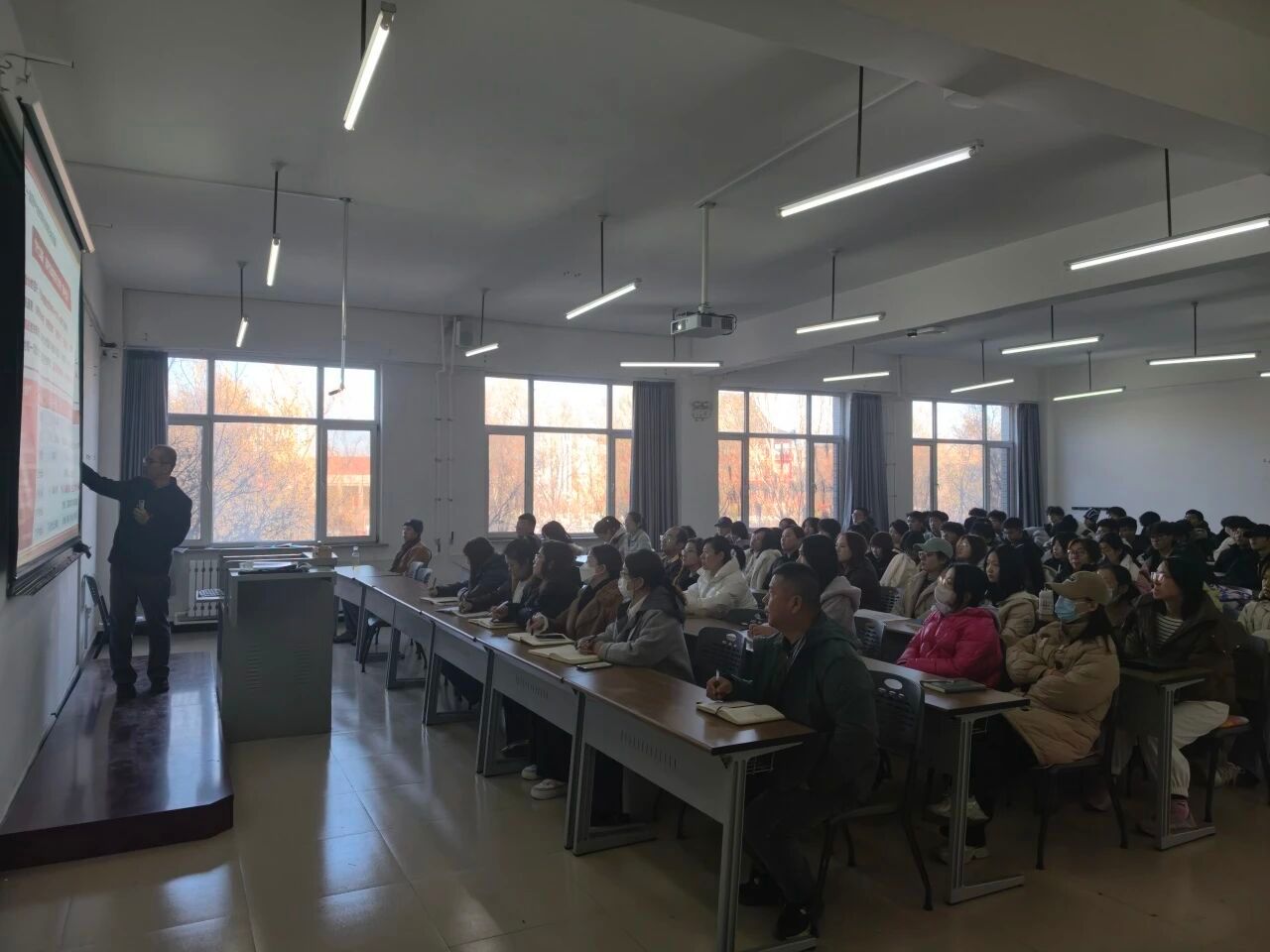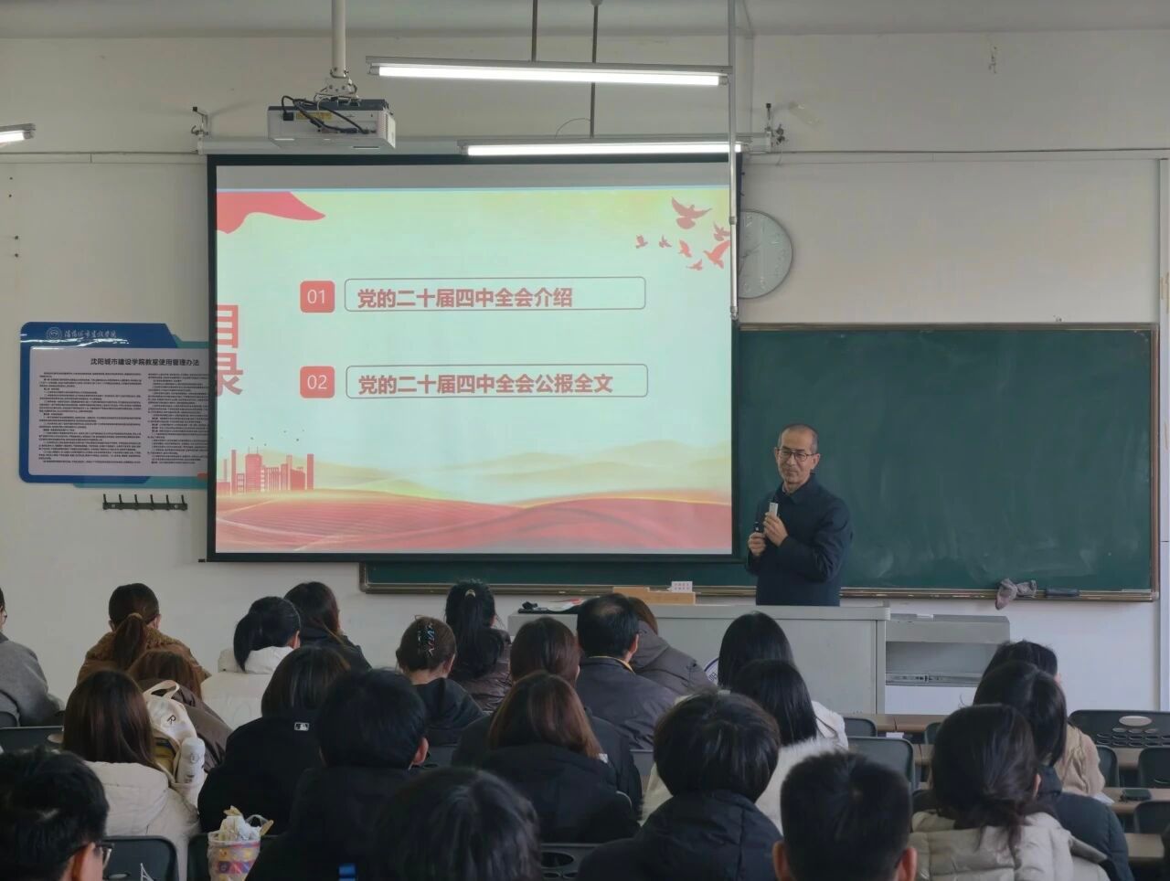 宣讲中,李宁围绕全会基本情况、核心精神和实践要求展开解读。他详细介绍了党的二十届四中全会的会议内容,重点阐述了全会审议通过《中共中央关于制定国民经济和社会发展第十五个五年规划的建议》的重大意义。结合学院专业特色,李宁着重解读了“十五五”时期经济社会发展的六个“坚持”原则,强调高质量发展、统筹发展和安全等重要理念,特别指出绿色转型、生态保护等与学院专业领域密切相关的部署要求。